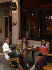 Das Dto., gesprochen "dito", befindet sich an prominenter Stelle in Frankfurt, früher einmal residierte dort das Dominique. Die kleine gemütliche Räumlichkeit mit vielen Sitzecken lädt zum angenehmen "Hang-On" ein. Das Publikum ist am frühen Abend eher etwas älter, hat sicherlich seine Sturm und Drang-Phase bereits hinter sich, tagsüber und unter der Woche finden sich aber auch hier viele Twens. Wer sich am frühen Abend in aller Ruhe unterhalten möchte und dafür gerne auf das Szene-typische Gedrängel verzichten kann, wird sich hier wohlfühlen.